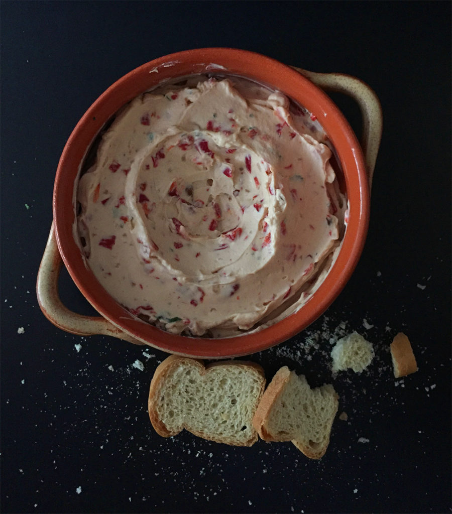 1. Para hacer el chile dulce morrón hay 3 posibles métodos. Todos con el mismo resultado.a. Meter el chile dulce rojo al horno a 250ºC durante 45 minutos. Rotarlo hasta que la mayor parte de la piel del chile esté carbonizado.b. Ponerlos encima de la flama de una cocina de gas hasta que la piel del chile quede negra.c. Colocarlos en la llama viva del fuego de la parrilla por unos segundos hasta que la piel quede negra. (esto va a intensificar el sabor ahumado).2. Cuando aún están tibios, meterlos en una bolsa para que el vapor suelte más fácilmente la piel del chile durante unos 15 minutos.3. Remover las semillas y la piel y picar finamente.4. Mezclar todos los ingredientes y verter el spread en un contenedor decorativo.Nota: se puede agregar más humo líquido para acentuar el sabor a ahumado. |